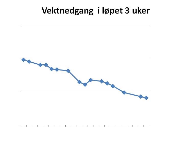 Jeg gikk raskt ned 3 kg første uka. Så litt til. Deretter stagnerte det og gikk til og med litt opp. Motivasjonen gikk tilsvarende ned. Men forfatteren av Clean skriver at det er vanlig og at man ikke må miste motet. Jeg fokuserte på at magen var flatere og klærne satt løsere. Og selvfølgelig har vekten gått videre nedover igjen. Totalt har jeg tatt av nesten 6 kg på 3 uker.