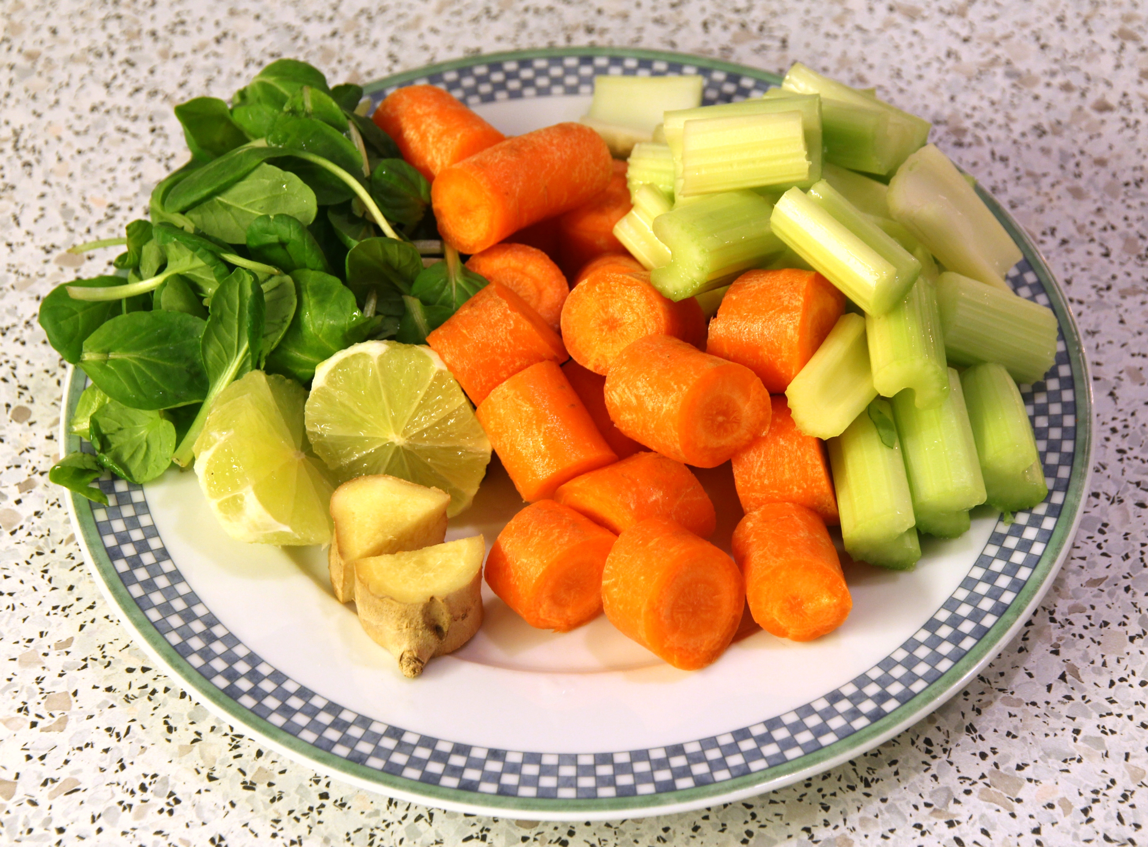Vask grønnsakene, kutt opp i biter og fjern skallet på limen før du mater det inn i maskinen. Andre ting som kan brukes er f.eks. kålrot, fennikel, kål, brokkolistilk, rødbete.