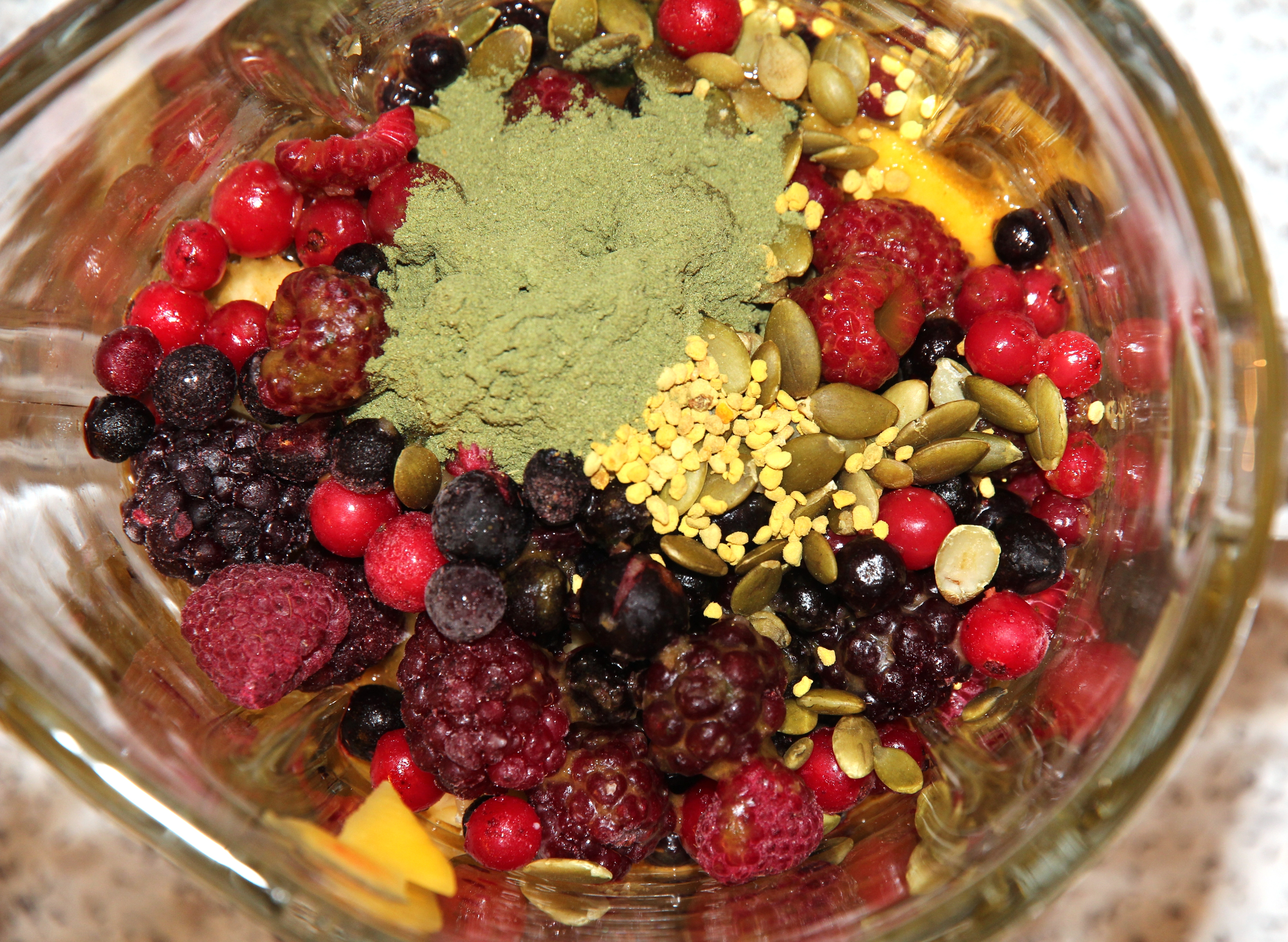 Det er mye supermat man kan ha oppi smoothie for å øke næringstettheten. Jeg har valgt å bruke gresskarkjerner for protein, Purely greens for å få med mer grønne grønnsaker og alger, samt bipollen for generell helsebringende effekt.