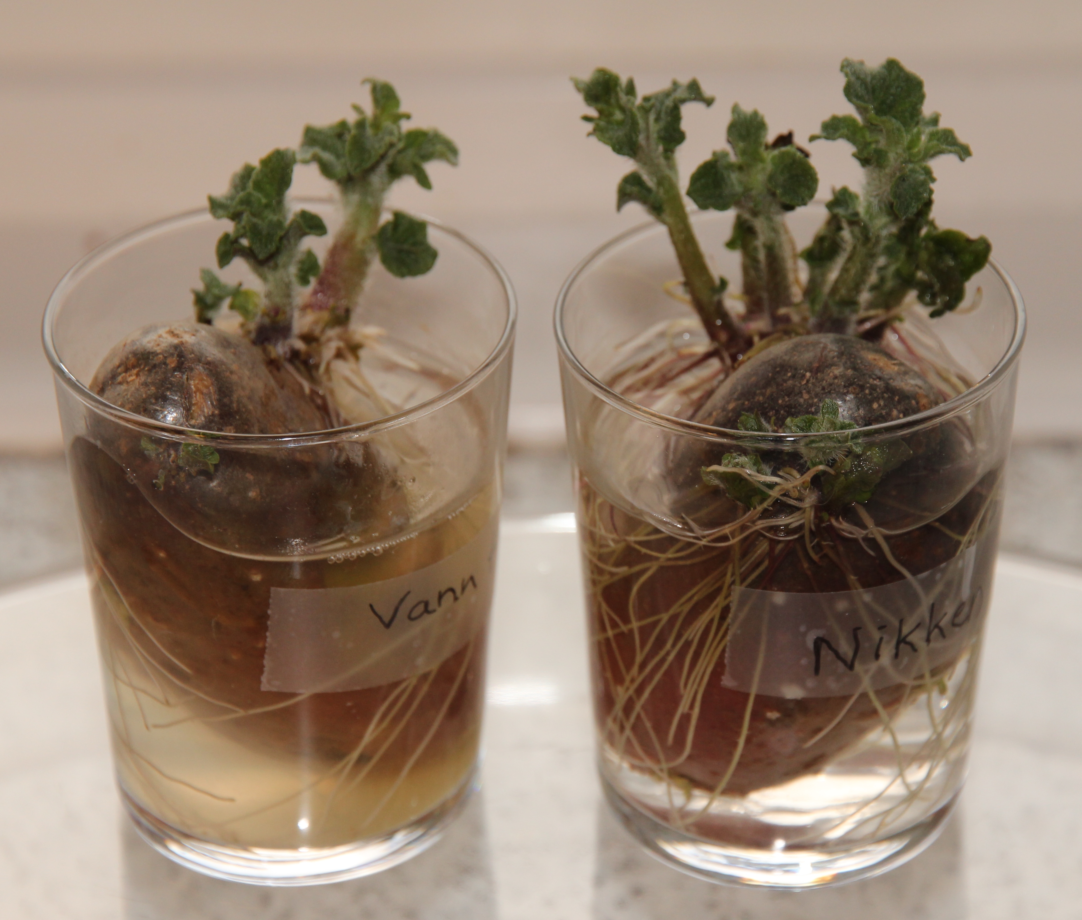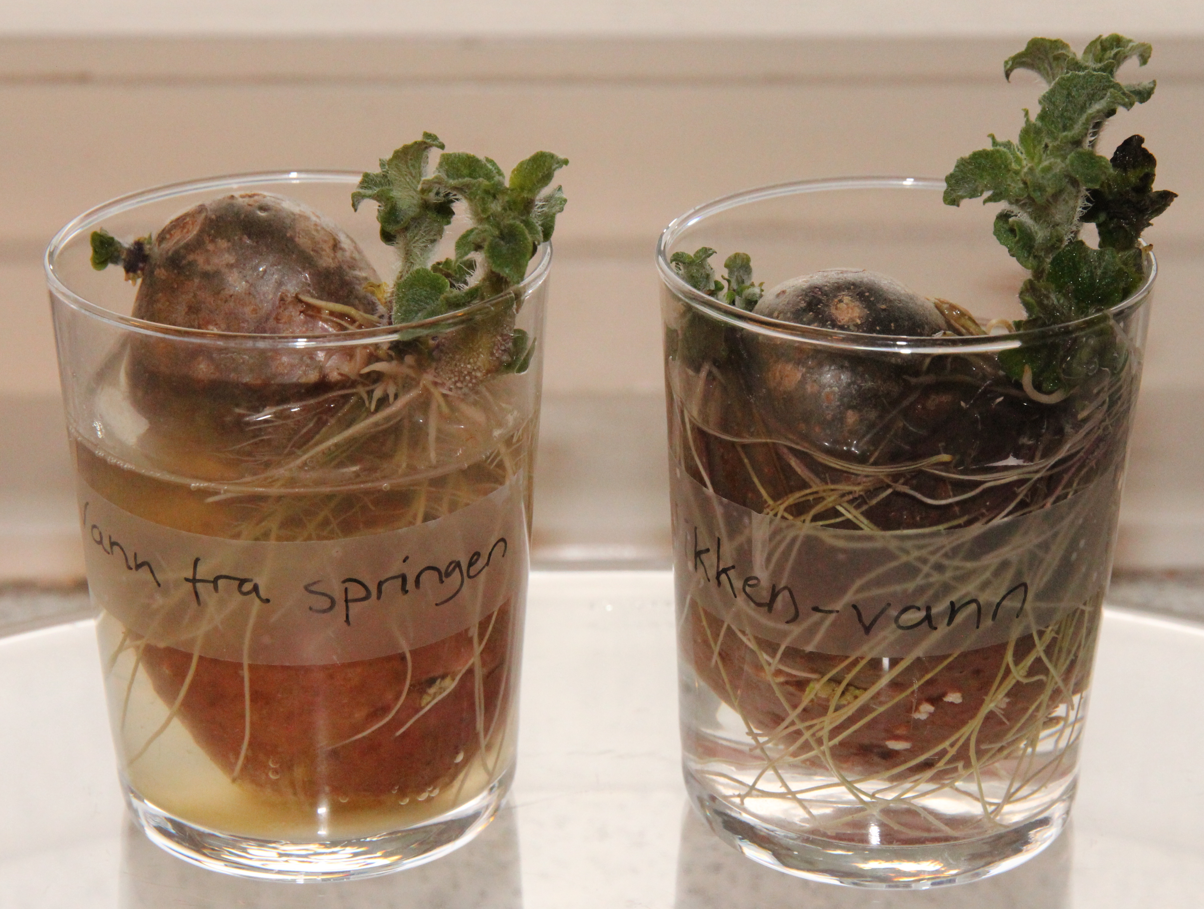 Jeg plasserte to poteter i hvert sitt glass vann, det ene med vann fra springen, det andre med vann fra Nikken-beholderen. Etter 4 uker så de slik ut: