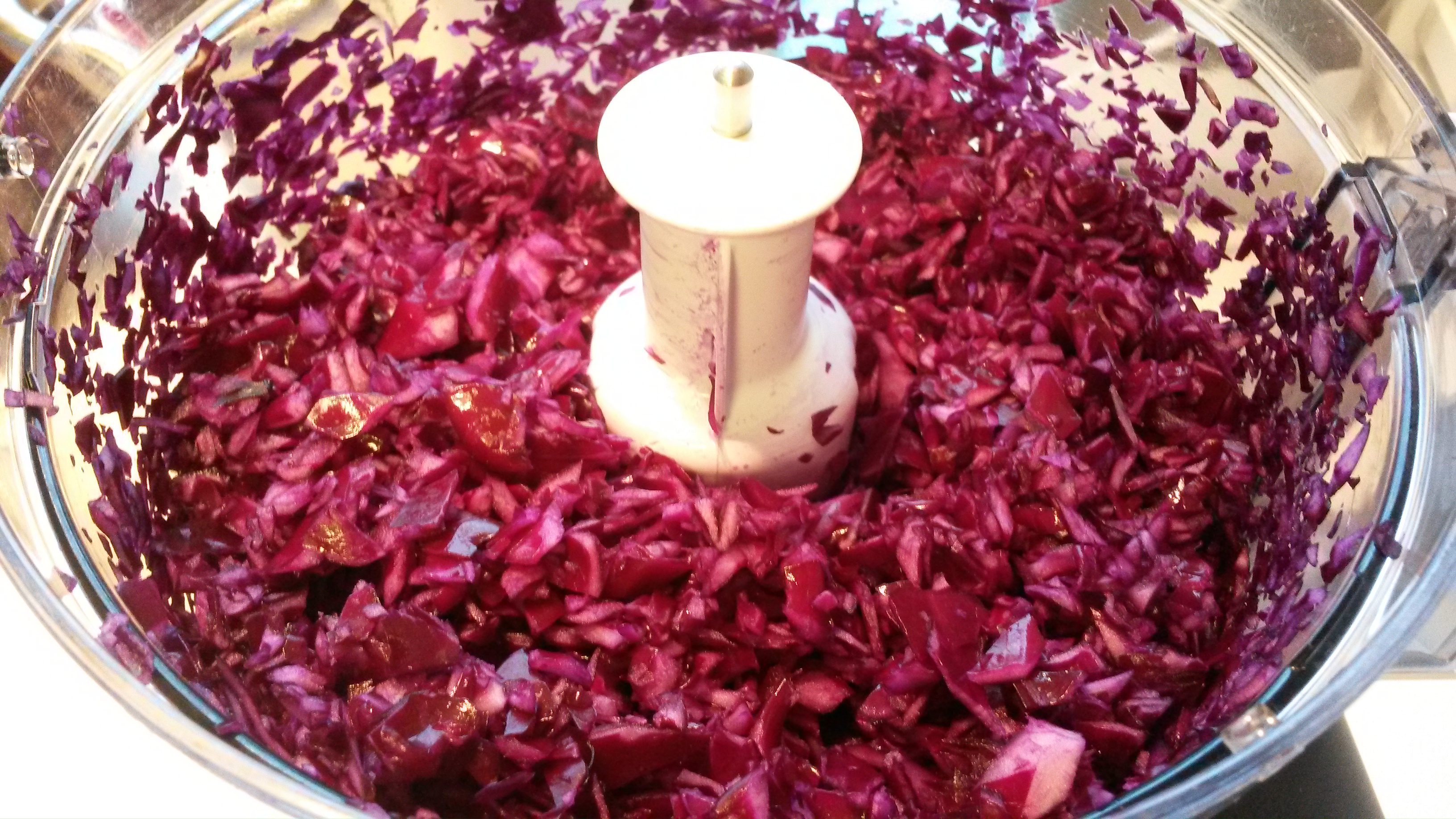 Skjær kålen i strimler. Gjør du dette for hånd tar det utrooolig lang tid (det har jeg prøvd – pfuy for en jobb!). Resultatet med håndstrimling blir veldig bra, men jeg velger heller den kjappe varianten og bruker kjøkkenmaskinen. Selv med kjøkkenmaskin tar det en times tid med all kuttingen hvis du lager den mengden jeg har satt opp. Legg båter av kålen oppi maskinen, ikke for mye av gangen, og sku på. Pass på at du ikke hakker det opp for smått. Det er ikke grøt vi skal lage.