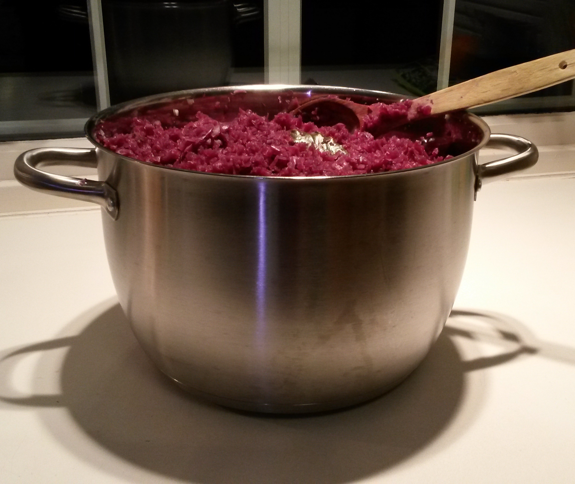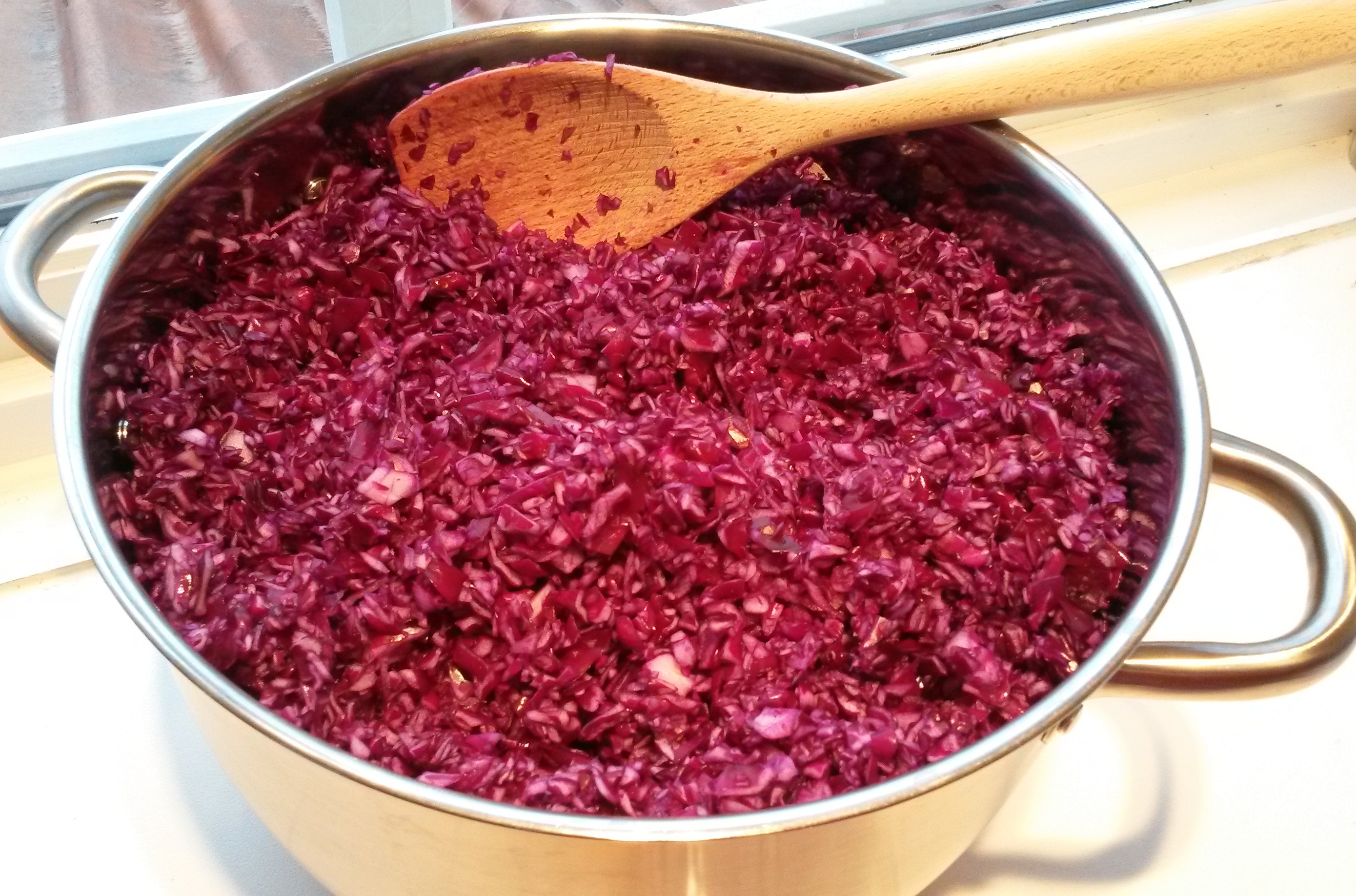Her er hele 10-liters kjelen full av hakket rødkål. Og jeg har ikke hatt oppi epler og rødløk ennå! Jeg måtte derfor fordele det på to store kjeler under kokingen. I løpet av kokingen faller imidlertid kålen sammen, så på slutten, før jeg smakte ferdig med eddik og salt/pepper, hadde jeg alt tilbake i en kjele igjen.